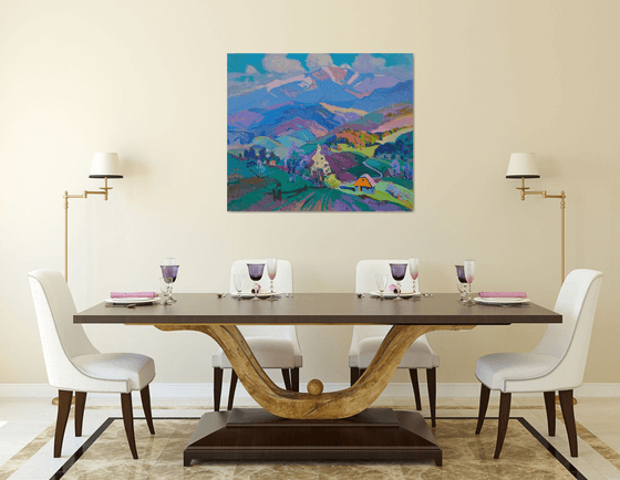 A vibrant, colorful landscape depicts rolling hills and a small house nestled in the countryside, set against a backdrop of majestic mountains. Bright shades of green, purple, and blue create a vivid and lively scene that evokes the beauty of nature.