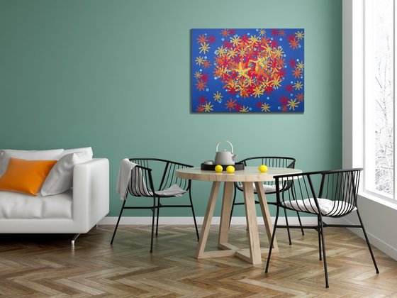 This original collage is one of the latest artworks of the talented contemporary Bulgarian professional artist Grigor Velev. In creating this vibrant collage, he joyfully embraces the union of geometric precision, pop art exuberance, and semi-abstract forms. The vivid oranges and yellows burst against the serene blue, portraying a dynamic underwater dance. It symbolizes life's vivid chaos and beauty, inviting viewers to feel the jubilant energy and mysterious depths. A piece that will invigorate and brighten any living space, radiating a sense of lively wonder.