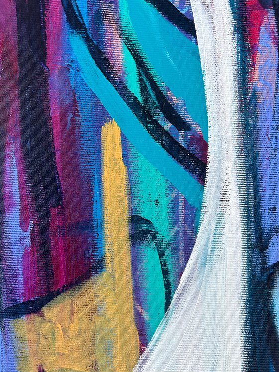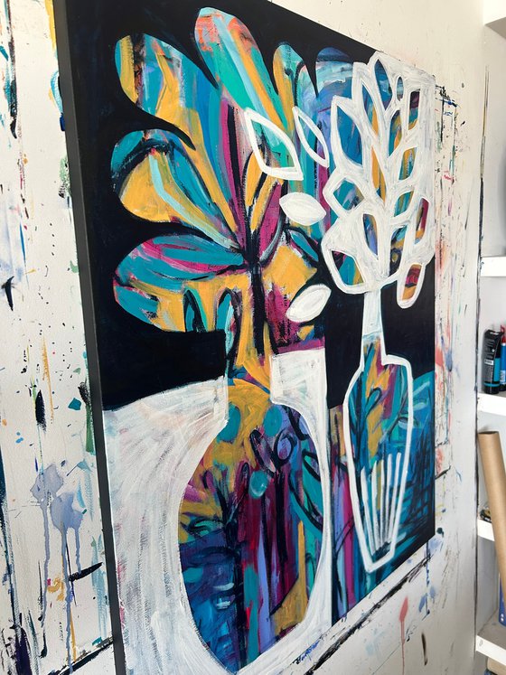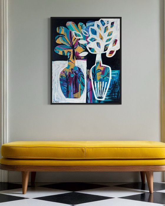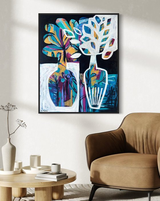 "Untitled Vases" is a work born from instinct and emotion. I followed the urge to be bold and expressive, layering shapes, colors, and marks until the colorful background was created. The white vase outlines appeared later bringing just enough structure and contrast to hold the energy and composition in place. There’s a conversation here between what’s seen and what’s felt. A tension between chaos and calm. Untitled Vases is about trusting the process, letting things unfold, and finding form in the unexpected. This expressive abstract work will make a statement in any space.