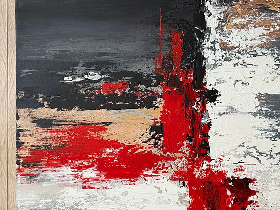 Urban Pulse is a bold abstract composition that captures the raw rhythm of urban life. This large-format painting (120 × 85 cm) explores the tension between structure and spontaneity through a powerful contrast of textures and colors. Vibrant crimson red intersects a field of layered neutrals — charcoal gray, warm sand, ivory white, and touches of rust — evoking the energy of a city in motion. The vertical and horizontal strokes resemble fragmented skylines, reflections, or echoes of sound, inviting viewers to interpret their own sense of place within the chaos and calm of modern life.