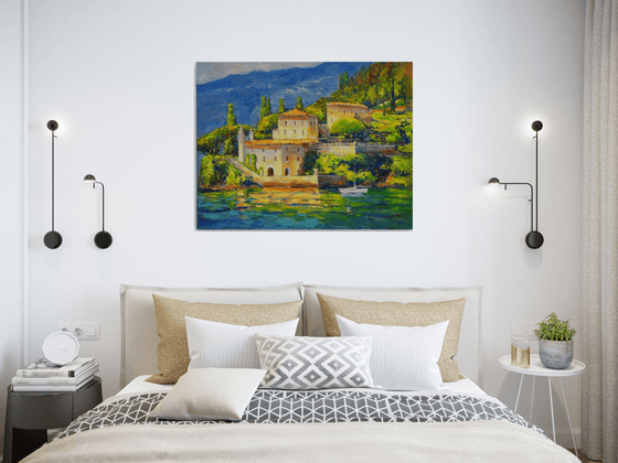 This vibrant painting transports us to a picturesque corner of Italy — Varenna, located on the shores of Lake Como. The sun's rays illuminate the green hills and reflect in the calm water, creating a play of light and shadow that gives the scene a special atmosphere of warmth and coziness. Inspired by Impressionism, the painting captures moments of nature filled with bright, vivid colors, evoking a sense of lively, pulsating energy.