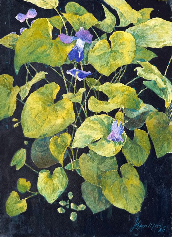 I painted the background black so the flowers pop up and glow, explored transparency of watercolor leaves and flowers opposite to the layers or black watercolor paint.