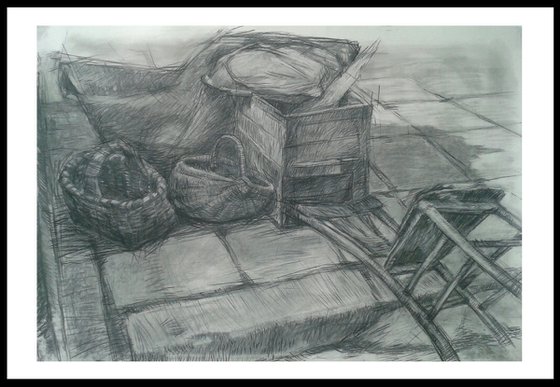 This original large drawing is one of the latest artworks of the talented Bulgarian professional artist. It represents one realistic rustic scenery. The realist scene is revealing abandoned remains of an old country house - wooden chair, chest and baskets. It's a beautiful black and white wall art and valuable housewarming gift.