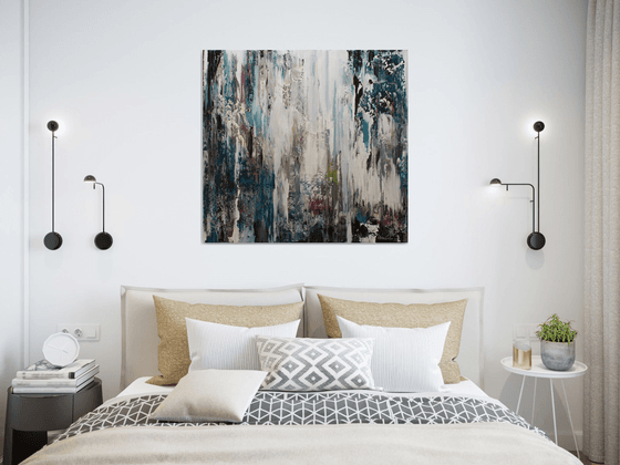 Abstract acrylic painting on a canvas inspired by a frozen waterfall. Visible structure. Cool colors from a little warm tons