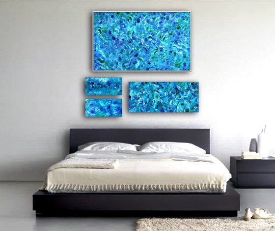This quadriptych consists of four completely unique and original abstract oil paintings on reclaimed, recycled wood. This multi-paneled work tackles the beauty of the planet in which we live, and all of the problems that are facing it and our survival. However, they are depicted in such an abstract way with cool, beautiful colors, that the mood of these pieces are peaceful and serene. It is a wonderful juxtaposition of theme and emotional effect. It prognosticates a future, overrun with water and floods. Perhaps this piece will inspire viewers to ponder and meditate on some deeper realities, while enjoying the beauty and serene colors and texture of the painting. Despite some of the underlying themes, there is a peaceful and hopeful energy to these pieces that will bring calm to your space. They are the perfect paintings for the right spot in your home or office.