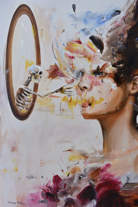 Painted in oil with a blend of figuration and abstraction, the work explores themes of vanity, identity, and the silent persistence of time.