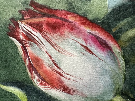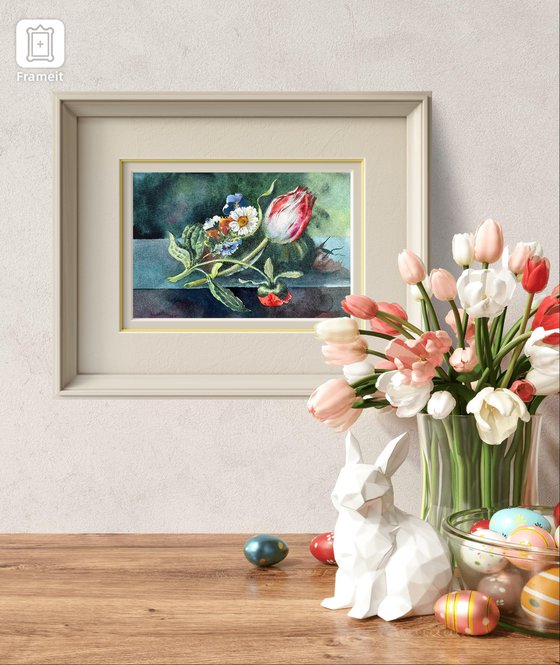 Inspired by the timeless floral compositions of Rachel Ruysch, this delicate watercolor painting captures a fleeting stillness — a tulip caught in mid-bloom, accompanied by wild daisies and pansies resting on a cool-toned surface. The lush, moody background highlights the elegant fragility of nature, giving the piece both classical charm and contemporary resonance.
