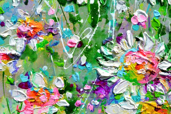 A beautiful modern daisies field painting, made in relief with palette knife with professional varnished acrylics and Amsterdam acrylic sprays on stretched heavy canvas.