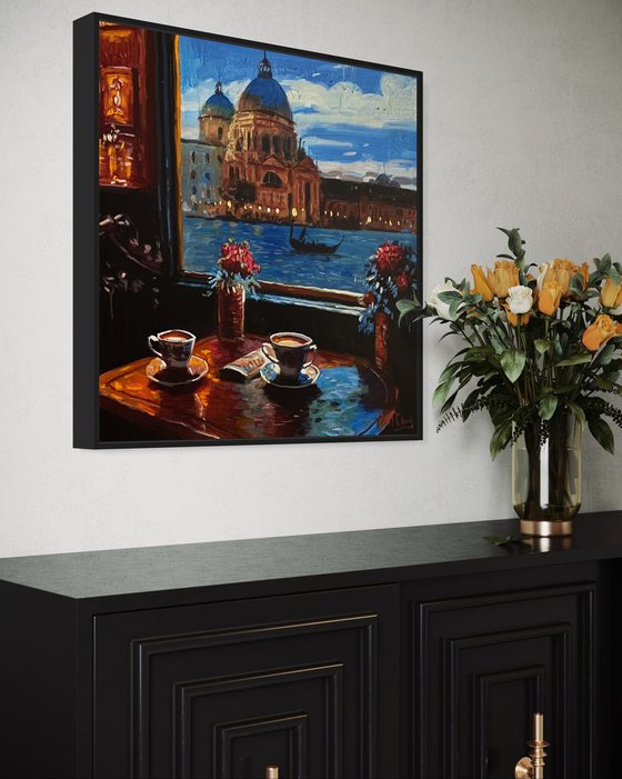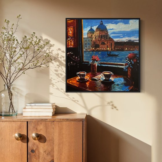 I painted this scene from a quiet café, gazing out at the Basilica di Santa Maria della Salute bathed in twilight. That moment felt suspended in time—fragrant coffee on the table, the shimmer of lights dancing on the canal, and a gondola silently gliding by. I wanted to capture that peaceful romance. I used thick brushstrokes to give the painting a textured, expressive quality, blending the warm glow of the interior with the cool blues of the Venetian night. The contrast creates a dialogue between the inside and the outside. The two coffee cups symbolize an unfinished conversation—about travel, memories, or perhaps someone we’re still waiting for.