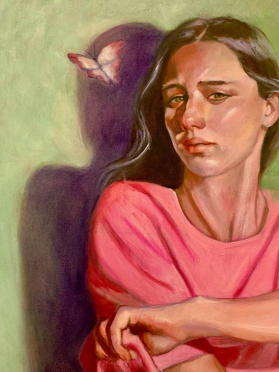 On the shadow that accompanies her, a butterfly lands silently: a light symbol of a thought that flies away, or perhaps remains.