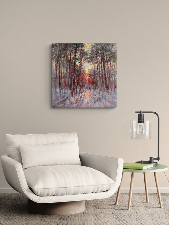 This oil painting, "Winter Pine Forest at Sunset," invites you into a quiet winter forest where the setting sun casts a golden glow on the pines and snow. Created by Anastasiia Valiulina, this original artwork combines impressionist style with the impasto technique, offering a richly textured and captivating landscape.