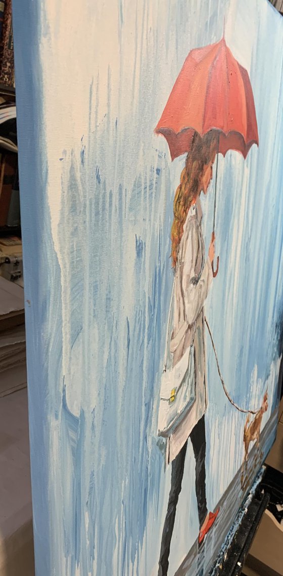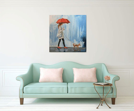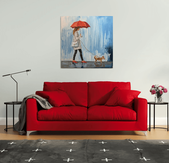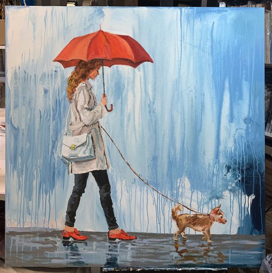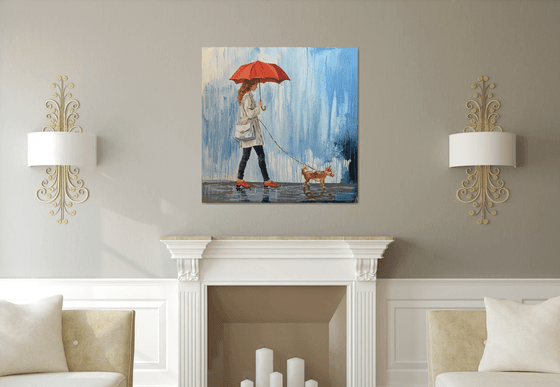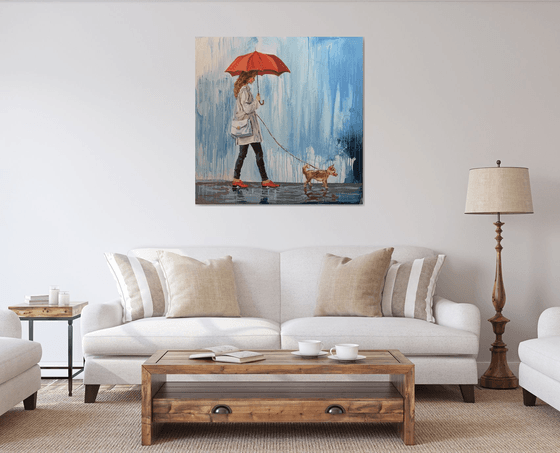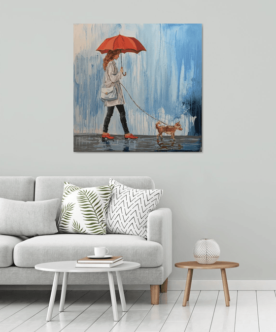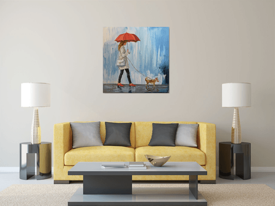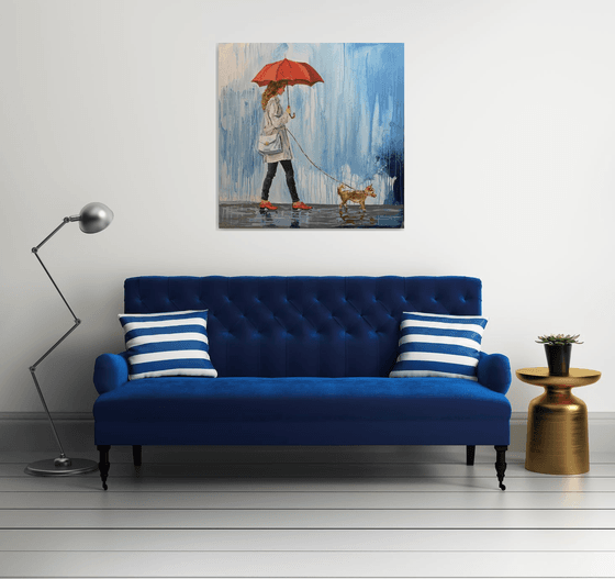 This semi-abstract painting captures a contemplative moment on a rainy day. The use of a minimalist approach to depict a woman figure with a small dog under a vibrant red umbrella is reflected, creating a powerful contrast against the cool, flowing blues of the background. Ideal for a modern home or a quiet office, this piece offers a sense of introspection and is perfect for dog owners or anyone drawn to the beauty found in everyday moments.