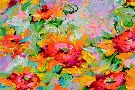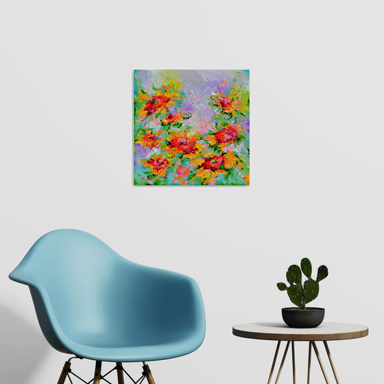 A beautiful modern sunflower field painting, made in relief with palette knife with professional varnished acrylics and Amsterdam acrylic sprays on stretched heavy canvas.