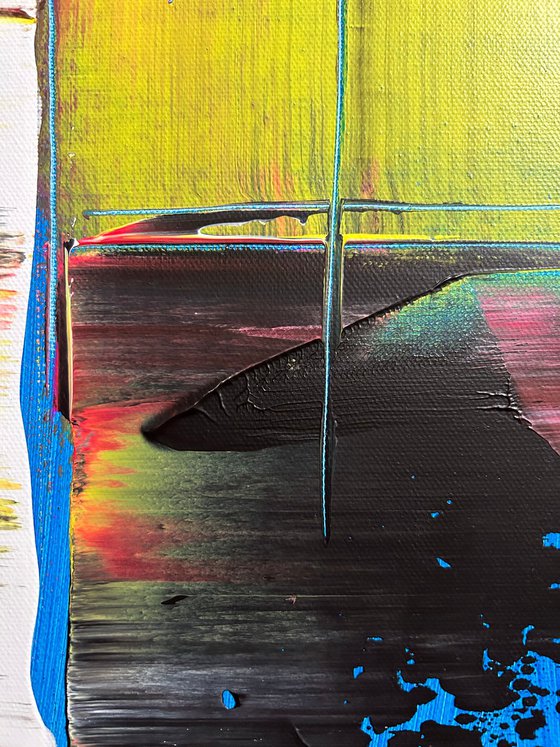 This is a unique modern PMS abstract acrylic painting that will make a statement in your home or office. This piece has a mature and dark modern design aesthetic. This painting is full of punk energy and darkness. It juxtaposes beauty with a rebellious feeling. The colors streak and overlap, while also being contrasted by subtle and bold color shifts. The colors are both vibrant and muted. The accents of bright pink, yellow, black, white and hints of blue is both modern and striking. Fragments of surface color and movement peek through the top layers of paint as bold colors streak and slice across the surface, creating a unique painterly design piece. It is truly an abstract modern painting like no other that will enhance your space.